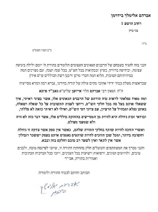 The Very First Written Brocho from the Mashpia Hagadol ‘Reb Meilich’ Biderman, ShlitaAvrohom Elimelech Biderman 1 Hoshea Street, Bnei Brak