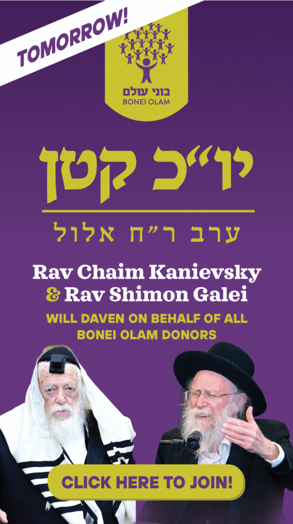 This Thursday, Erev Rosh Chodesh Elul, Rav Chaim Kanievsky and Rav Shimon Galei will be reciting special Yom Kippur Kotton tefillos on behalf of donors to Bonei Olam.