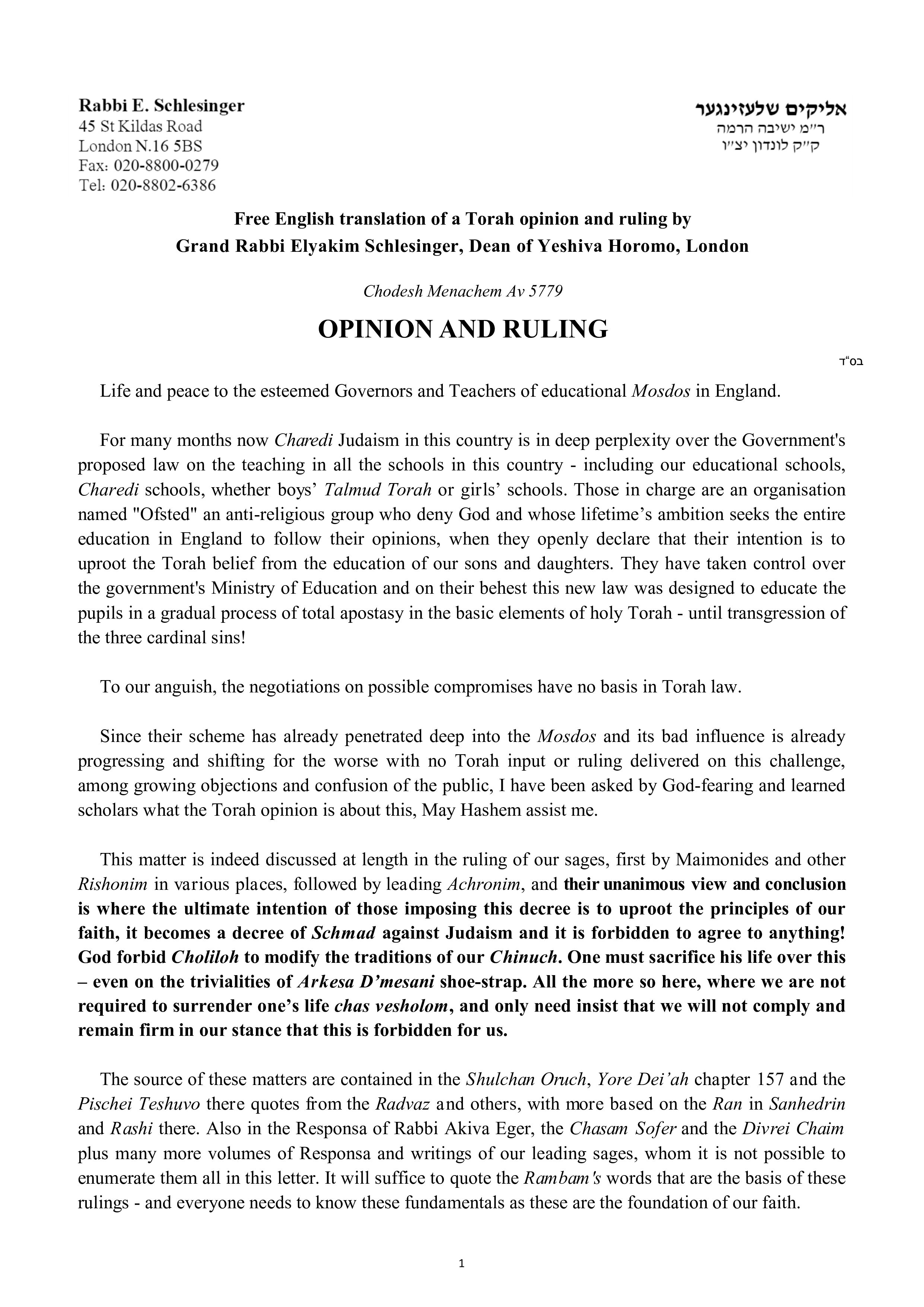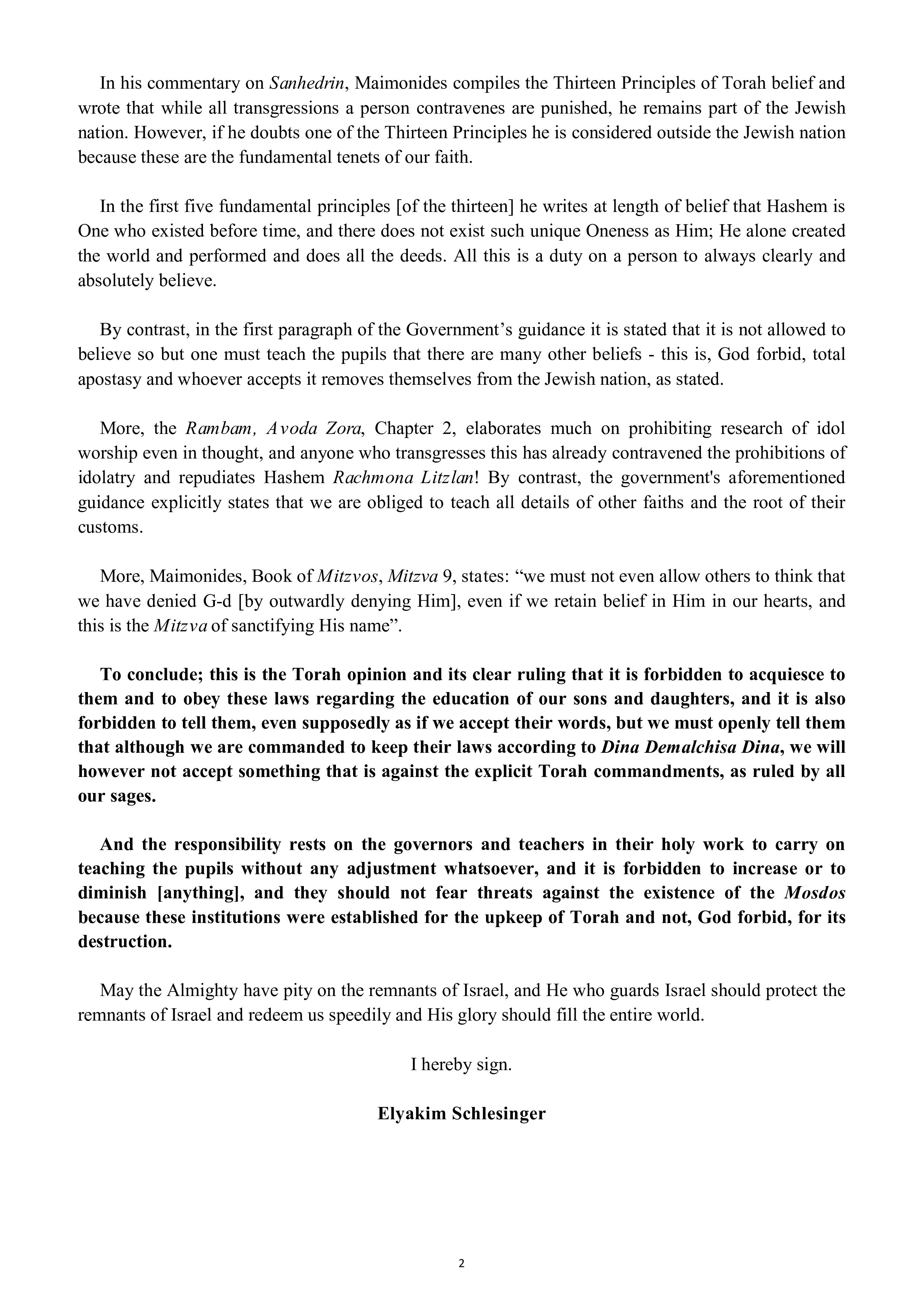 The Gaon Rabbi Schlesinger seals his letter, saying: ” To conclude; this is the Torah opinion and its clear ruling that it is forbidden to acquiesce to them and to obey these laws regarding the education of our sons and daughters, and it is also forbidden to tell them, even supposedly as if we accept their words, but we must openly tell them that although we are commanded to keep their laws according to Dina Demalchisa Dina, we will however not accept something that is against the explicit Torah commandments, as ruled by all our sages.”