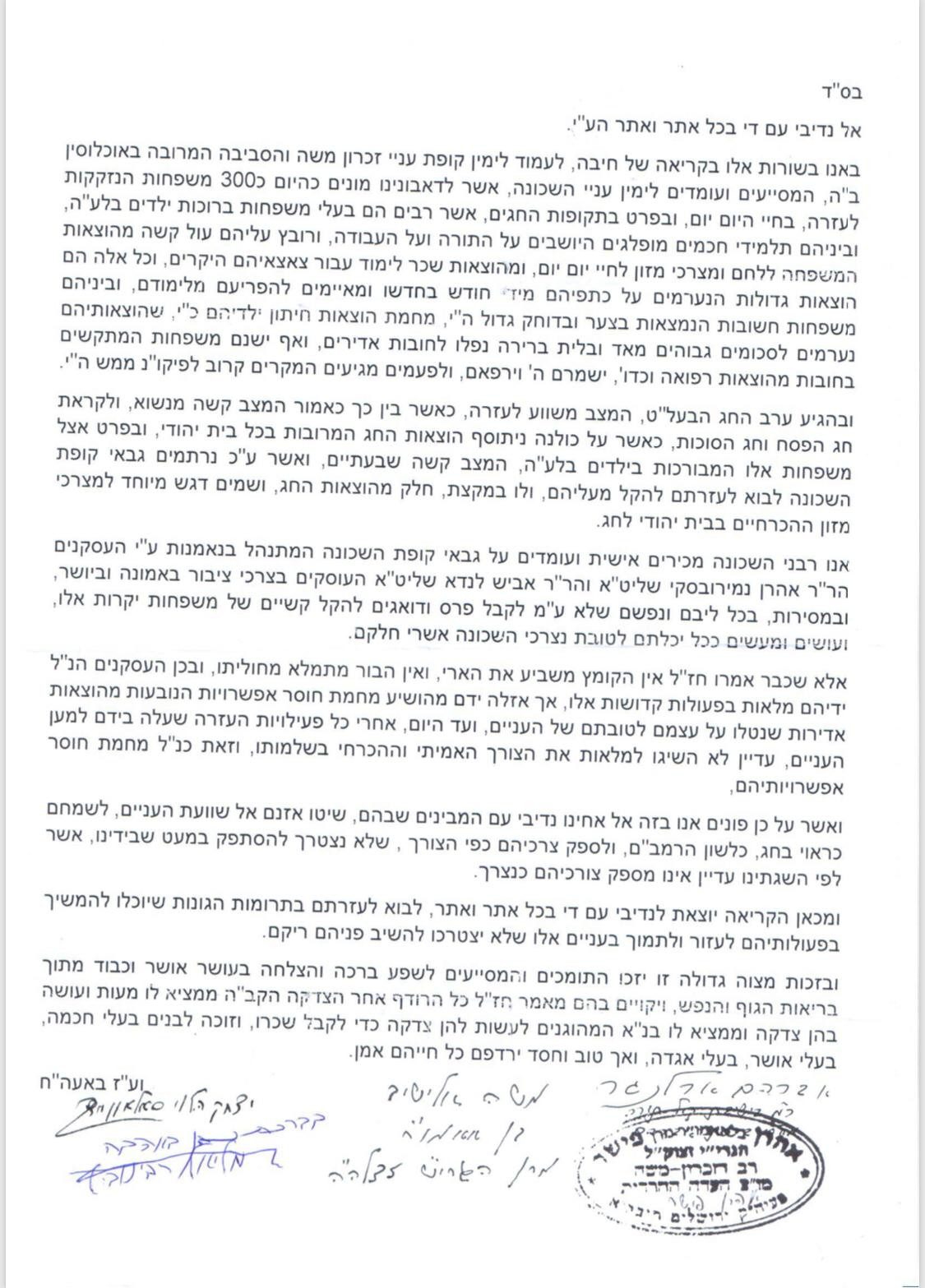 Kupas Zichron Moshe was established over 10 years ago by Rav Aaron Nimerovsky, to assist the needy families in the Zichron Moshe neighborhood in Yerushalayim with Shabbos and Yom Tov expenses. Today, over 350 families are benefiting from the kupah, with the largest disbursement in Chodesh Tishrei to cover the steep costs of the Yomim Tovim.