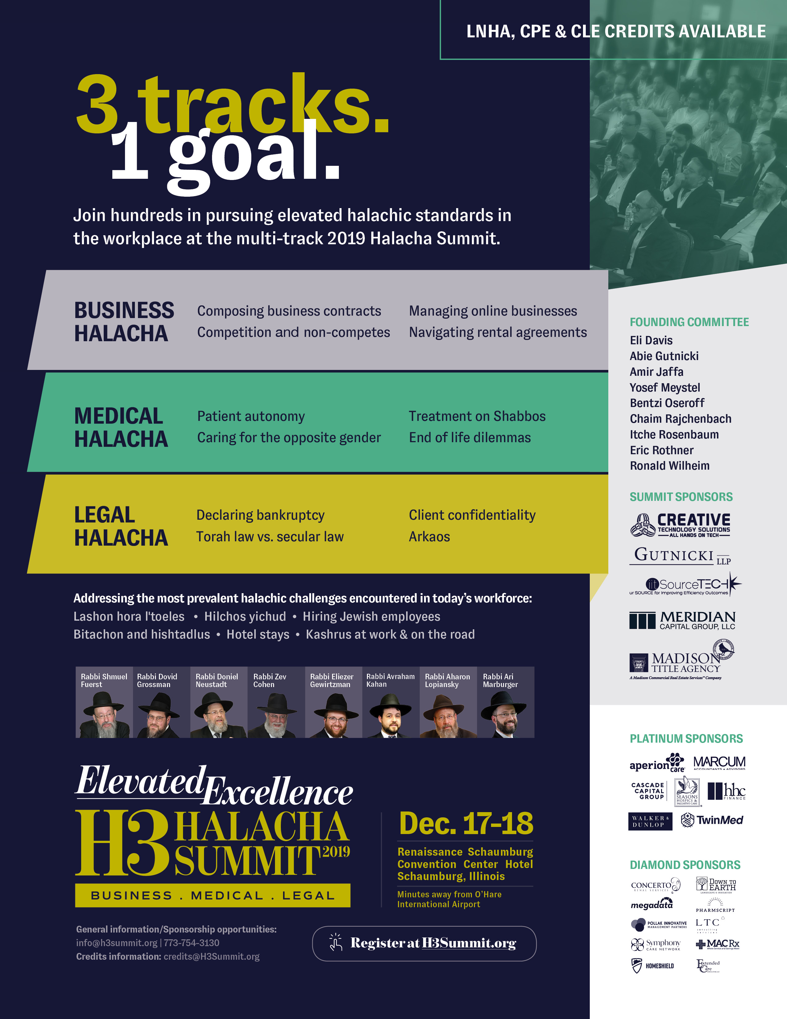 Last year, the Midwest Agudah created a Business Halacha Summit, an event that was met with an outpouring of positive feedback. In response to the popular request, this year’s Summit has been expanded to include tracks for those in the medical and legal fields as well, and accordingly, the name of the event has been changed to the H3 Summit.