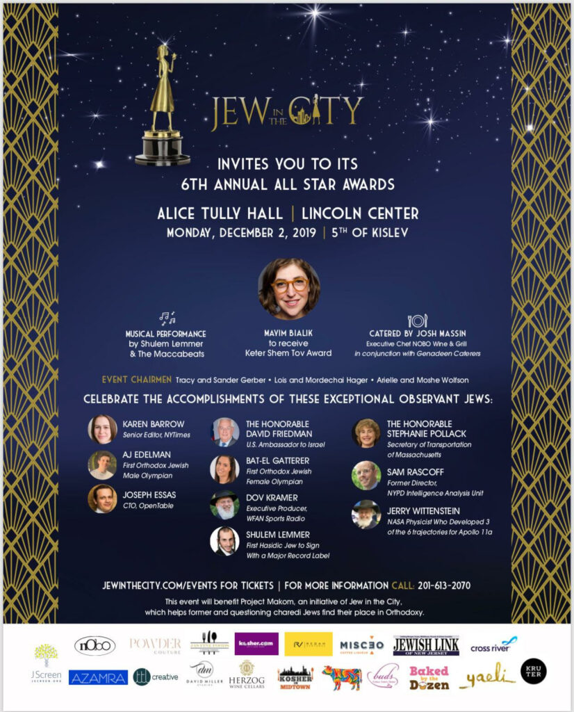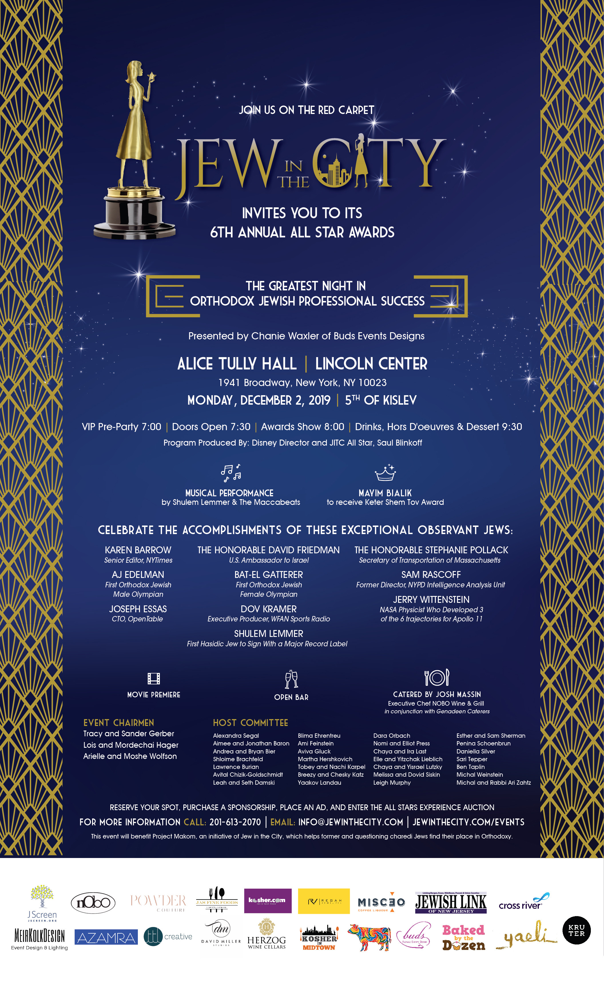 Now in its 6th year, taking place at Lincoln Center’s Alice Tully Hall, the All Star Awards is a night of kiddush Hashem and inspiration – highlighting some of the most accomplished religious Jews in the world today as part of Jew in the City’s mission of rebranding Orthodox Jews and Judaism.