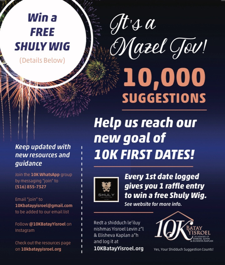 I want to offer my heartfelt thanks to the founders of 10K Batay Yisroel that continuously give of themselves so selflessly to administer the site and constantly improve the project. We extend an invitation to everyone to please visit 10KBatayYisroel.org and become inspired to join our holy mission. May HKB”H bentch our join efforts so that we can truly bring simcha to all of the singles in Klal Yisroel who are relying on us.