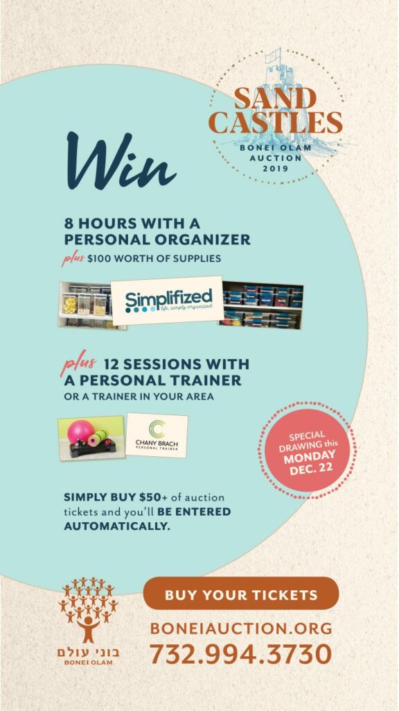 Spend $50 or more this week and be entered into an exclusive Bonei Olam auction to win 8 hours with a personal organizer (anywhere in the Tri-State area) + 12 sessions with a personal trainer.