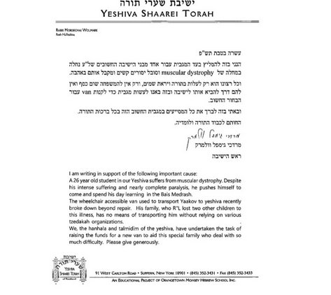 Yaakov is a 26-year-old בחור suffering from a debilitating illness called Muscular Dystrophy. Muscular Dystrophy is a devastating disease that causes the deterioration of the muscular tissue resulting in limited mobility and function. Yaakov is wheelchair bound with paralysis affecting his entire body leaving him with just limited use of his fingers and neck. Yaakov is attended to by round the clock nurses as well as his devoted parents whose lives revolve around his care and his needs. Sadly, within the last few years Yaakov lost a brother to the same illness, and a sister to a similar disease. Yaakov’s life is one filled with so much struggle and pain, but that has not diminished is aspirations for true growth in torah and yiras shamayim. On a portable respirator and trache, Yaakov attends yeshiva everyday where he learns two sedorim a day with every bit of strength he can muster. With every excuse not to be in front of his gemara Yaakov searches for every opportunity to further his shtieging painstakingly writing down every shiur and pursuing the sugya with utmost hasmada in rishonim and achronim, because for Yaakov לולי תורתך שעשעי אז אבדתי בעניי