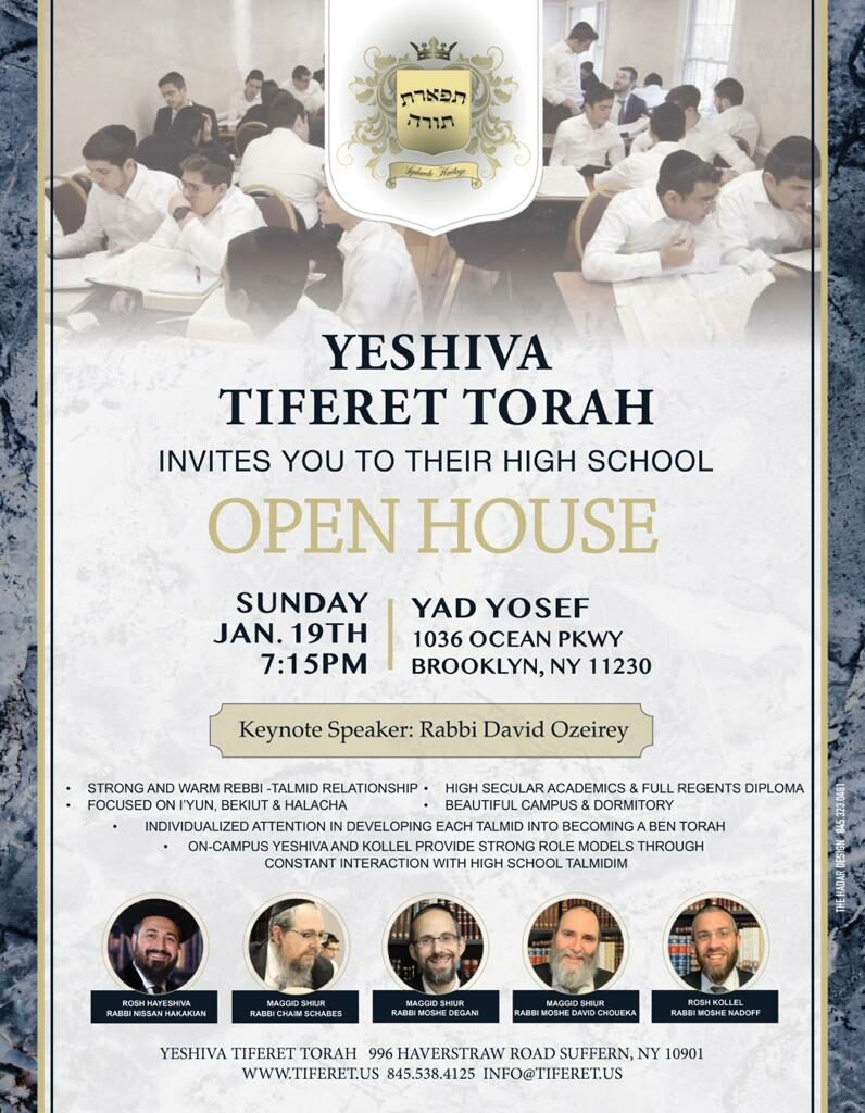The Open House will be held at Yad Yosef, 1036 Ocean Parkway, Brooklyn, NY 11230, 7:15 PM. Please contact 845-538-4125, [email protected] for more information or visit www.Tiferet.us. You can reach the Rosh HaYeshiva Rabbi Nissan Hakakian at 845-596-1170.