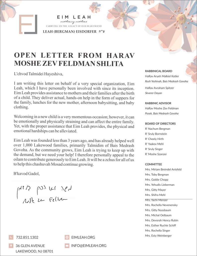 Eim Leah has dedicated the Zichron Boruch Supper Program