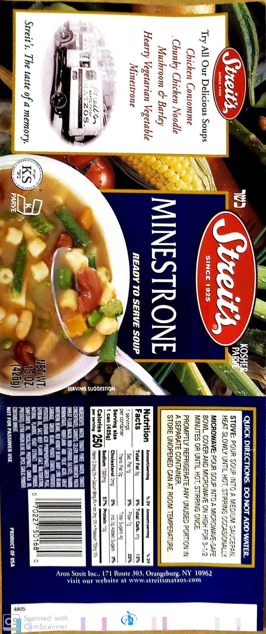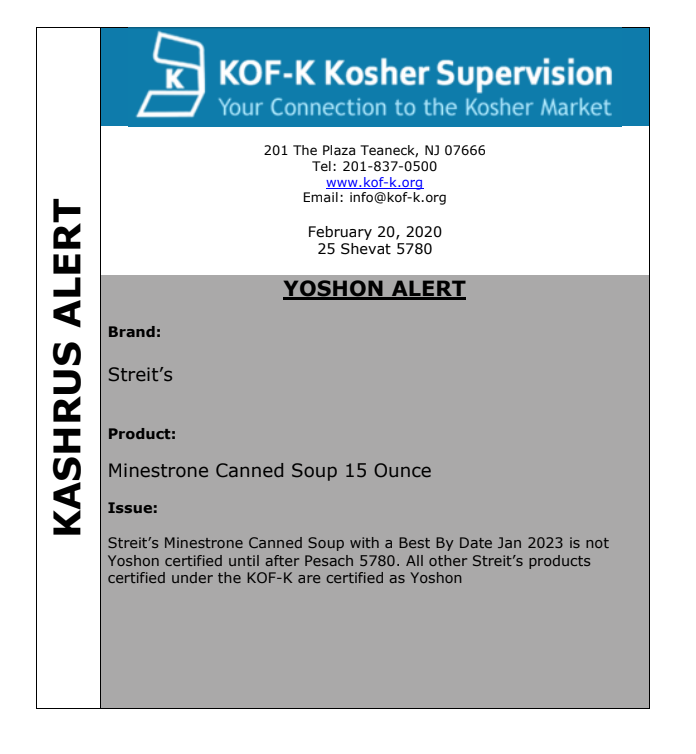 Kashrus Alert: Streit’s – Yoshon Alert/Minestrone Canned Soup