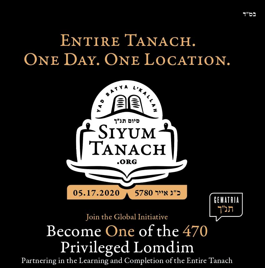 On Sunday May 17, 2020 just a few days prior to Matan Torah , 470 Lomdim (Gematria of תנ”ך) will gather and study the ENTIRE TANACH in ONE day in ONE location. Thereafter, all the Lomdim and their spouses and major contributors will celebrate with a Grand Seudas Mitzvah with Sefirah-appropriate entertainment.