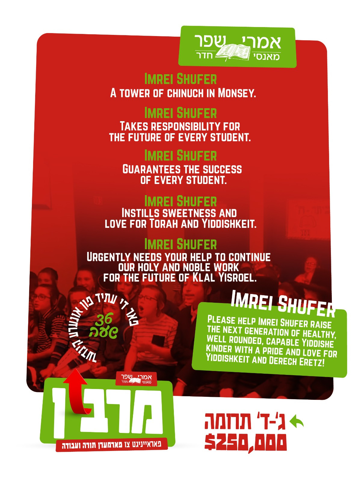 Nestled in the heart of Monsey, on 186 Saddle River Road is Cheder Imrei Shufer. What sets Us apart from others? Unlike the usual Chasidish Cheiders, Cheider Imrei Shufer Monsey is a Cheder for the parents, by the parents. We are not affiliated with any Khila, therefore enabling us to revolutionize the way we educate our students.