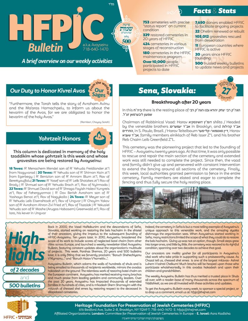 HFPJC – Avoyseinu started very simply, as one family traveled to find the resting place of their ancestors. They were shocked and horrified at the condition of the kevarim and committed to reverse this situation and help others who were on the same journey, people who also wanted to preserve the dignity and kavod of their grandparents.