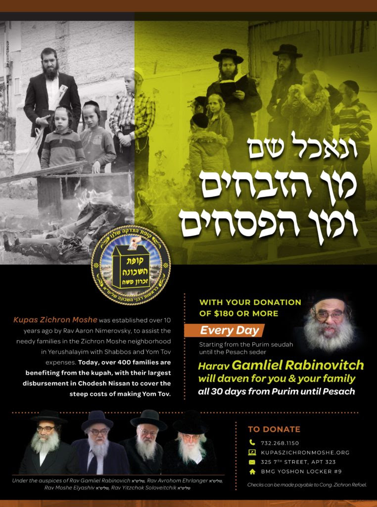 This year due to the unfortunate growth of the needy in Zichron Moshe, Rav Gamliel Rabinowitz is taking an unusual step, and will hold a special tefillah every day, for all the donors and their families to Kupas Zichron Moshe of $180 or more.