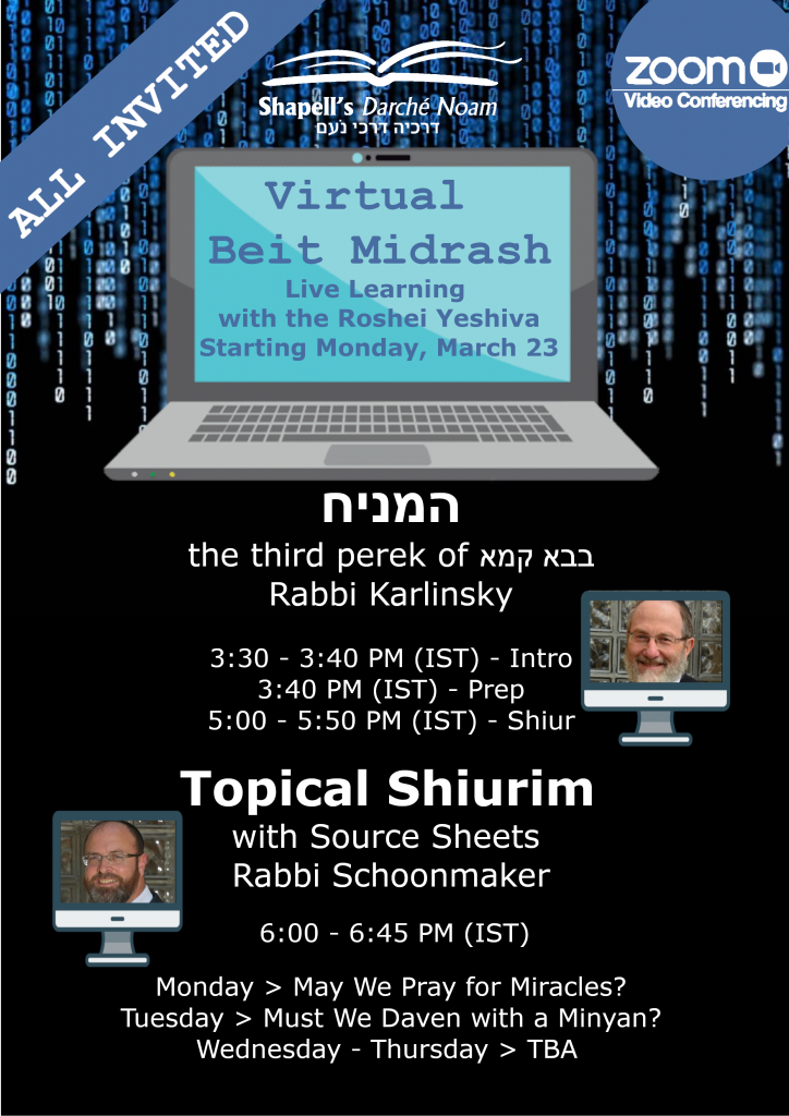 In this time of world wide crisis, Shapell’s/Darche Noam in Yerushlayaim continues to do all that it can to spread Torah- not just to its own talmidim and alumni, but world wide! On Monday 27 Adar/ March 23, the yeshiva began a “Virtual Beit Midrash” program.