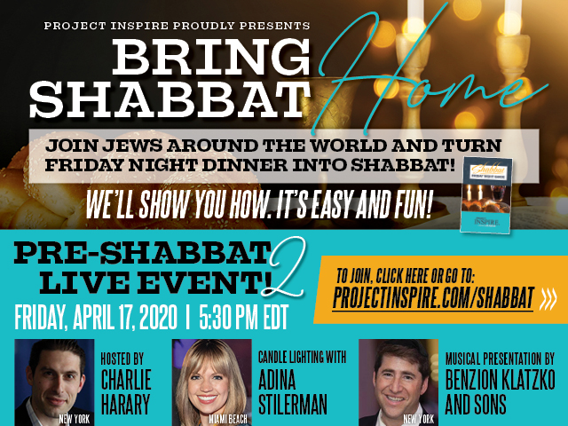 On Friday, April 17, at 5:30 p.m., Project Inspire will host a Pre-Shabbat live celebration, free of charge, which can be viewed at Projectinspire.com/shabbat. The event will be hosted by the dynamic Charlie Harary, who combines inspiration, education and entertainment in an unforgettable message. There will be a special intro to candle-lighting by kiruv dynamo Adina Stillerman, as well as live music by Benzion Klatzko and sons. As a bonus, there will be a Friday night guide and checklist to download to help people turn Friday night family dinner into a full Shabbat experience.