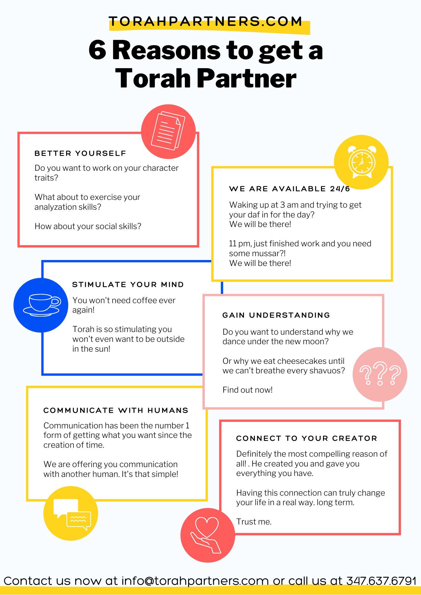 Contact us now at [email protected] 347.637.6791 or 058.780.9957 (e”y)Fill out an application at www.torahpartners.com