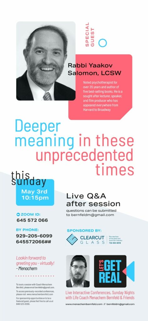 This Sunday, May 3 2020, Rabbi Yaakov Salomon will be joining as a guest. Rabbi Yaakov Salomon, LCSW, is a noted psychotherapist, in private practice in Jackson, NJ, for over 35 years. He is the author of five best-selling books published by Artscroll, and is a sought after lecturer, speaker, and film producer who has appeared everywhere from Harvard to Broadway. Rabbi Salomon will open the conversation in the next session titled “A deeper understanding/meaning of these unprecedented times.”