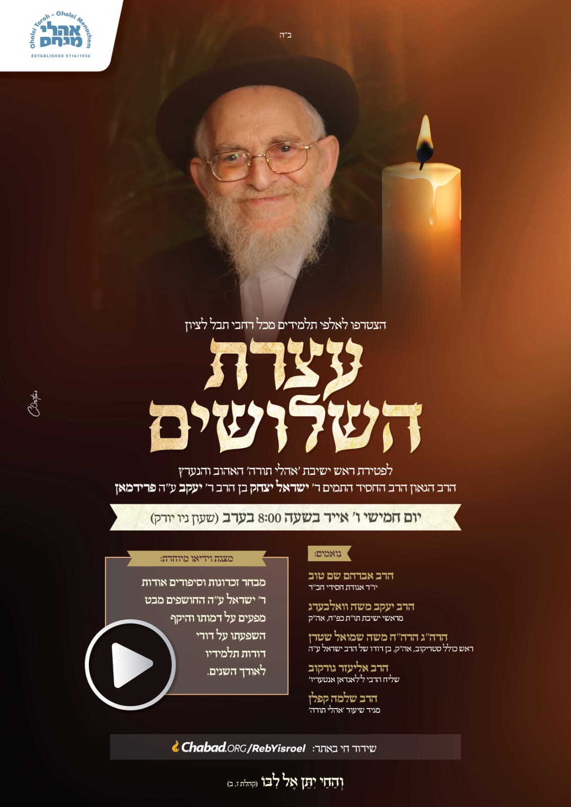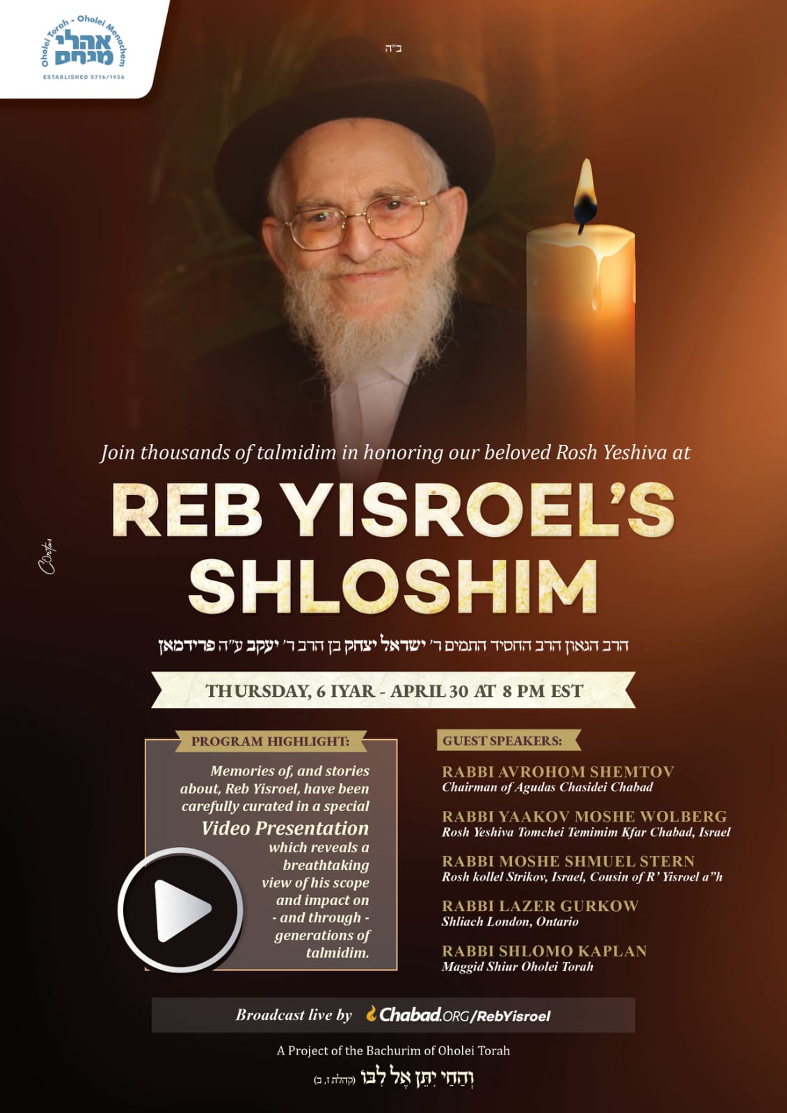 Join thousands in honoring the esteemed rosh yeshiva, Rabbi Yisroel Friedman of blessed memory, a Talmudic genius and exemplary chassid, who taught and inspired generations of Talmidim. This special broadcast presents beautiful memories and stories about Reb Yisroel in a special video presentation, and features guest speakers.