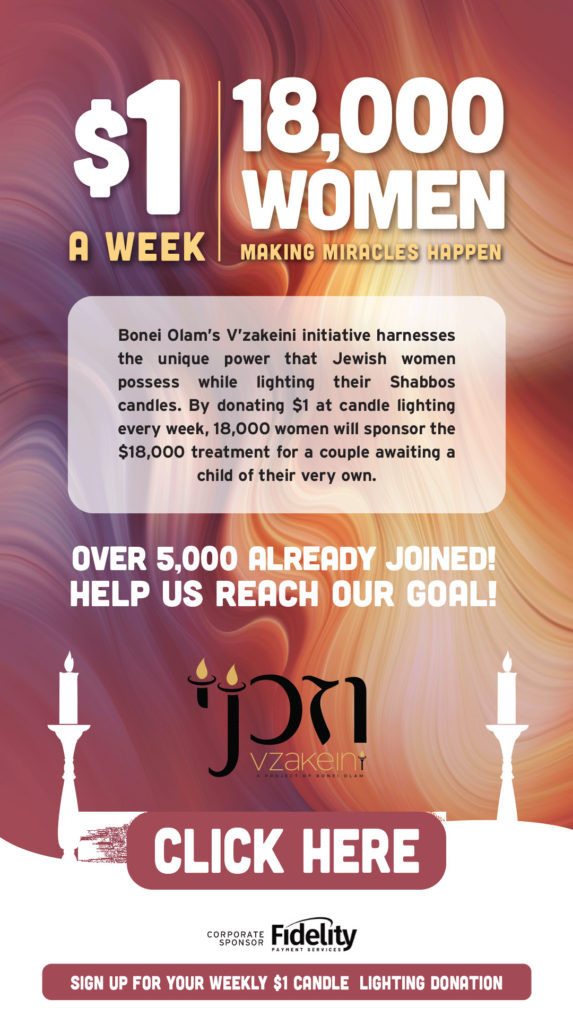 When we at Bonei Olam started the V’zakeini campaign, we had no idea that the coronavirus was at our doorsteps. The first few weeks started off strong. Almost a thousand women signed up the first week, and the signups were building rapidly. Then the coronavirus hit. We didn’t know what would be and we weren’t sure what to do. Should we continue as usual? Or should we pause the campaign? But then I thought of my couples. Sitting at home–a quiet home–without the distractions of children, toddlers, school hotlines or zoom calls, and waiting. Just waiting. They already met with doctors. They already took the tests. They already were approved for treatment. But they are quietly waiting for funds. Even as the economy takes a hit like we haven’t seen in any of our lifetimes, even as past donors are now trying to recoup their losses, even as our largest fundraisers have been postponed, my couples are quietly waiting for a precious light in their life. And so, together with my incredible team, I decided to go ahead with the campaign. In a world of chaos, 18 thousand Jewish women will not only think of themselves, but they will think of their sisters as well, and they will give with an open heart. And what do you know? A little from me and a little from you; and now, we are five thousand strong. Five thousand women is a strong power. Five thousand dollars and five thousand tefillos each week and already we are hearing good news from our couples. But we can do better and we will. You, can still be one of these women. One click (HERE), and you can say “I care” with $1 dollar every week at candle lighting time, and a short prayer while you light those candles– “May the treatments I help cover be effective.” For $1 a week you can buy hope for a childless couple. With your prayers combined with 17,999 others, you can make miracles happen. Let’s open our hearts to another’s pain and help a quiet household ring with the sweet sound of a newborn’s cry. A little something from eighteen thousand women goes a long way.Please click here to sign up. Your friend on a mission,