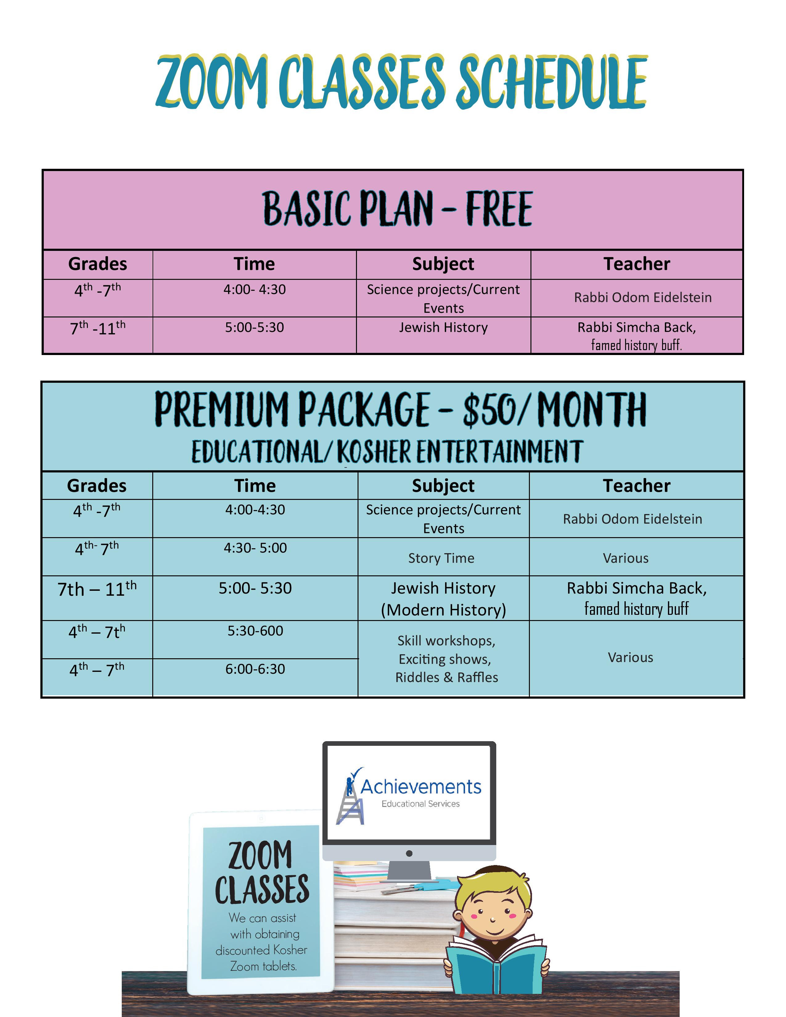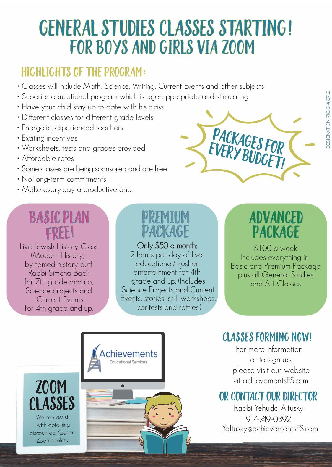 Achievements is happy to inform the public that classrooms are now forming for boys in grades Primary -11 in a wide variety of subjects, taught by charismatic, experienced teachers. Setup is very easy, and we are working with a company to secure affordable kosher Zoom tablets for all families that do not already have devices capable of supporting Zoom. Tuition is very affordable, and no long-term commitments are required. The program includes worksheets, tests, and grades, as well as exciting incentives and prizes.