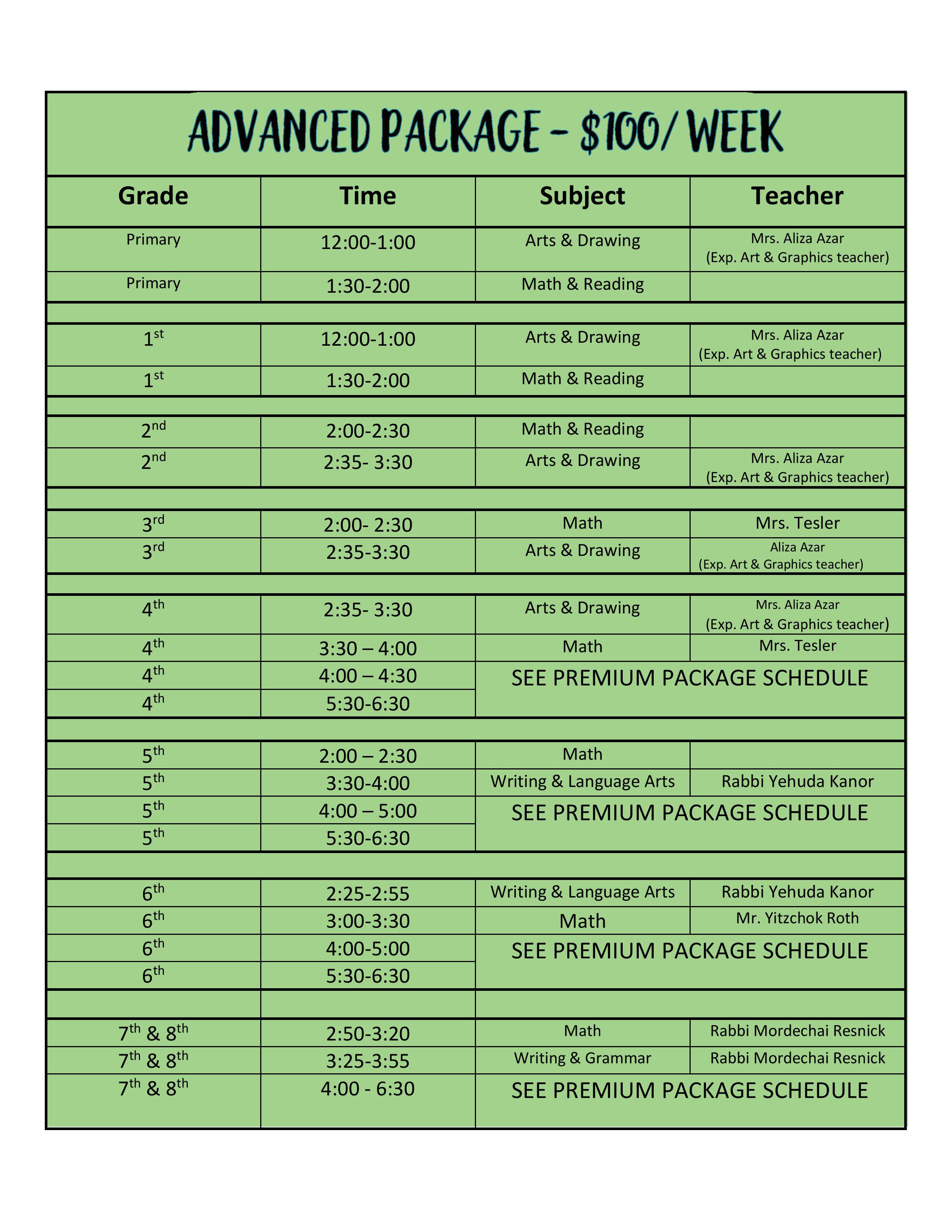 Advanced Package: $100/week. Includes access to Basic and COVID programs, plus exclusive full line of educational classes in a wide variety of General Studies subjects, including: math, science, language arts, history, and current events.