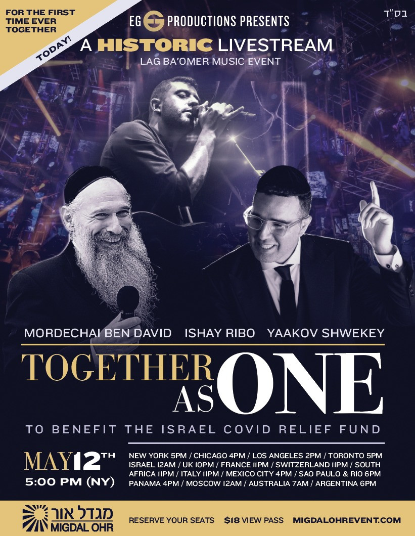 Produced by Eli Gerstner, the concert titled “Together As One” will feature these three megastars performing for the first time together. The concert will be hosted by Migdal Ohr and will benefit Magen Yisrael – Israel Shield, Migdal Ohr’s Covid 19 Relief Fund.