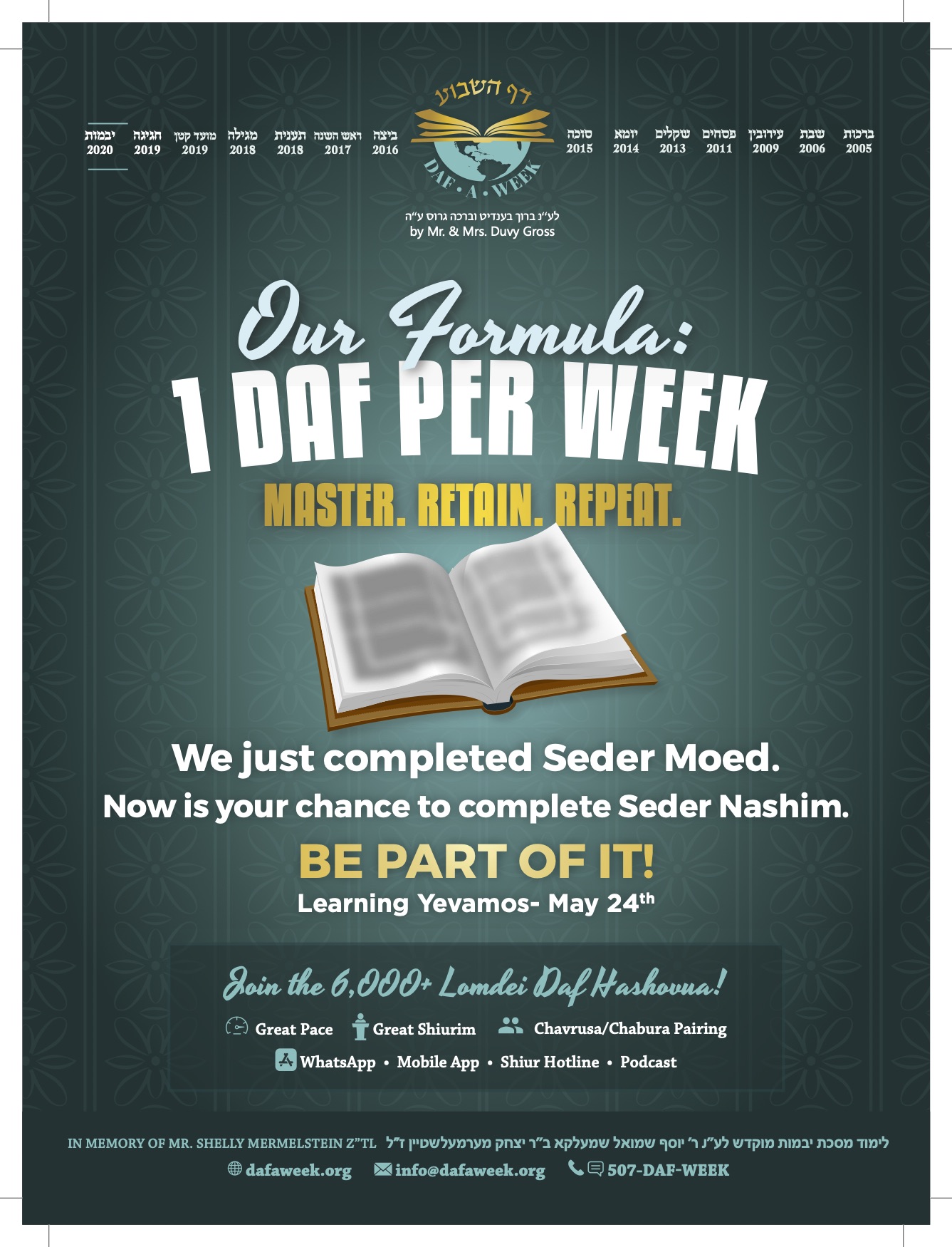 This Sunday, on Rosh Chodesh Sivan, a monumental event occurred over the world. No, it had nothing to do with the corona virus, although it was affected by it. And it wasn’t connected to the political fallout from the virus. Rather it was a preparation for Kabbalas Hatorah that spanned the globe. As the well-known Rashi writes the acceptance of the Torah hinges on the unity of Klal Yisroel – “K’ish Echad B’Leiv Echad”. And on this day, Jews from Australia to Ashdod, from France to Far Rockaway took part in the Siyum of Seder Moed of the weekly daf learning program Daf Hashovua. After an amazing fourteen years of learning, reviewing and in-depth learning of page after page of Seder Moed, this amazing milestone has finally been reached.