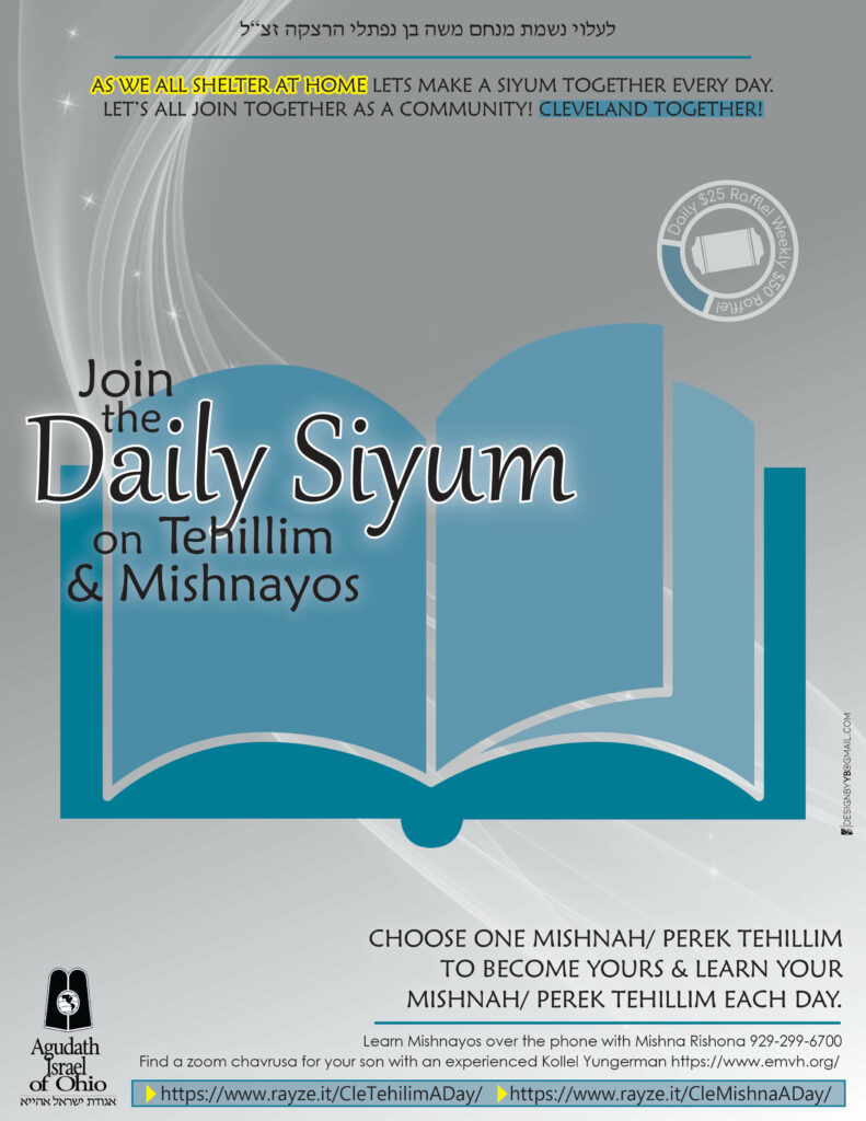 In the wake of the coronavirus, an exciting project was launched by the Cleveland community to make a siyum everyday on Mishanyos and Tehillim. Thousands of hours of learning and a feeling of accomplishment for our children was achieved. The Mishnayos A Day and Tehillim A Day program was dedicated in memory of Menachem Moshe Ben Naftali Herzka Z”L AND is now open for anyone to sign up. There are daily and weekly raffles for all participants. Join the program and help us finish Shisha Sidrei Mishna every day.