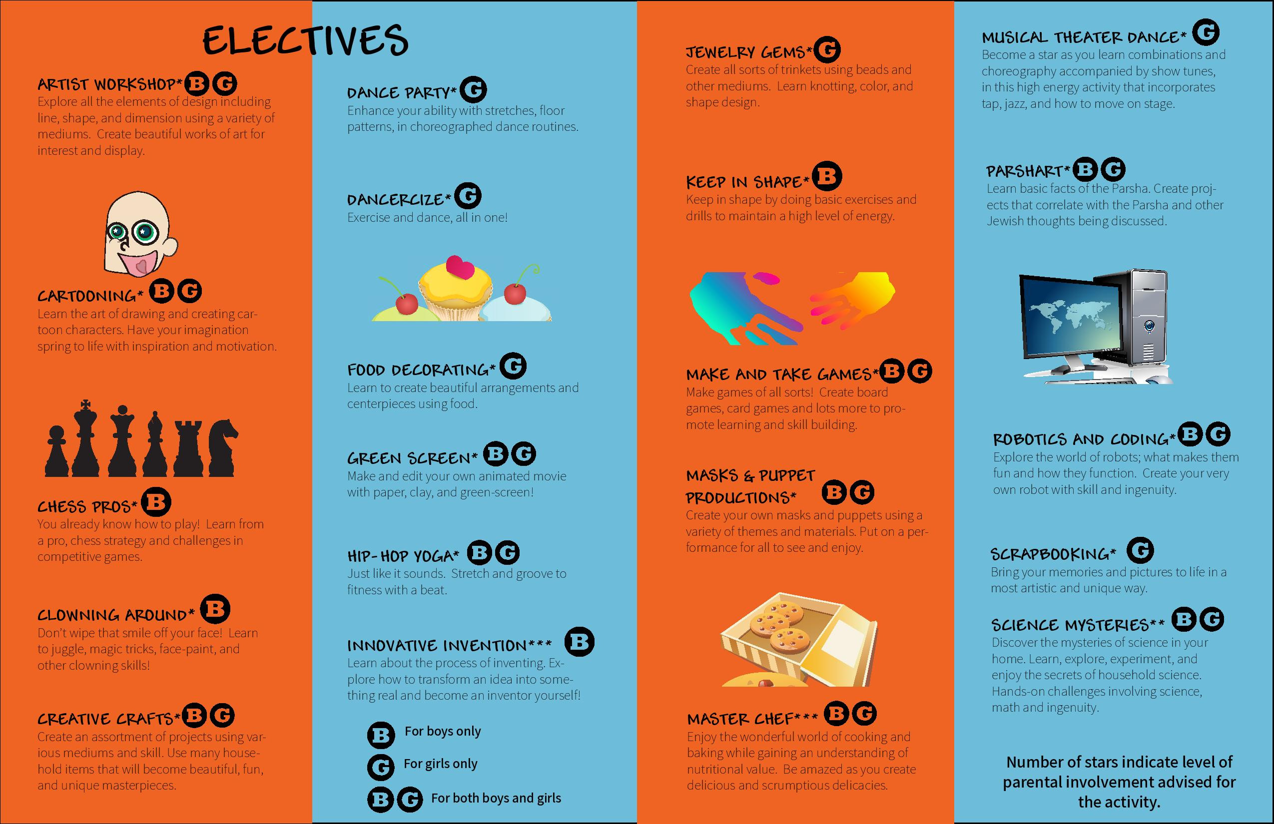 Aside from continuing with Torah learning and structure, the summer is not complete without fun and action, and our program will incorporate that as well. With daily main activities, shows, games and fun, students will have a great time and get to know kids from all over the country. Unique to our program will be electives, and students will pre-register for their choice of a variety of fun and wholesome activities. Camp in a Box kits with the necessary materials will be provided in advance, and each group will meet on Zoom with their instructor regularly to take the next step in their selected project.