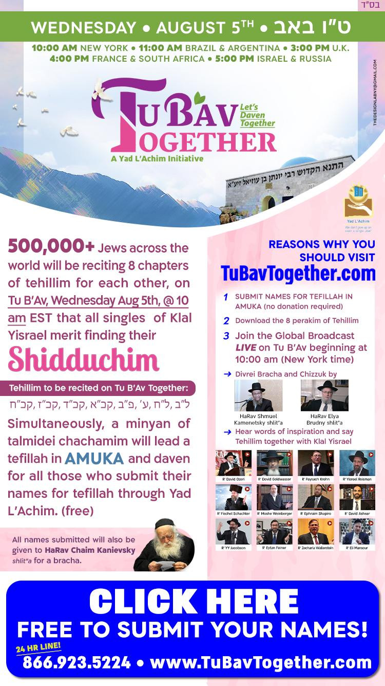 CLICK HERE or visit TuBavTogether.com to submit names for free to Amuka and HaRav Chaim Kanievsky shlit”a in advance of Tu B’Av Together or call the 24 hour hotline at 866-923-5224