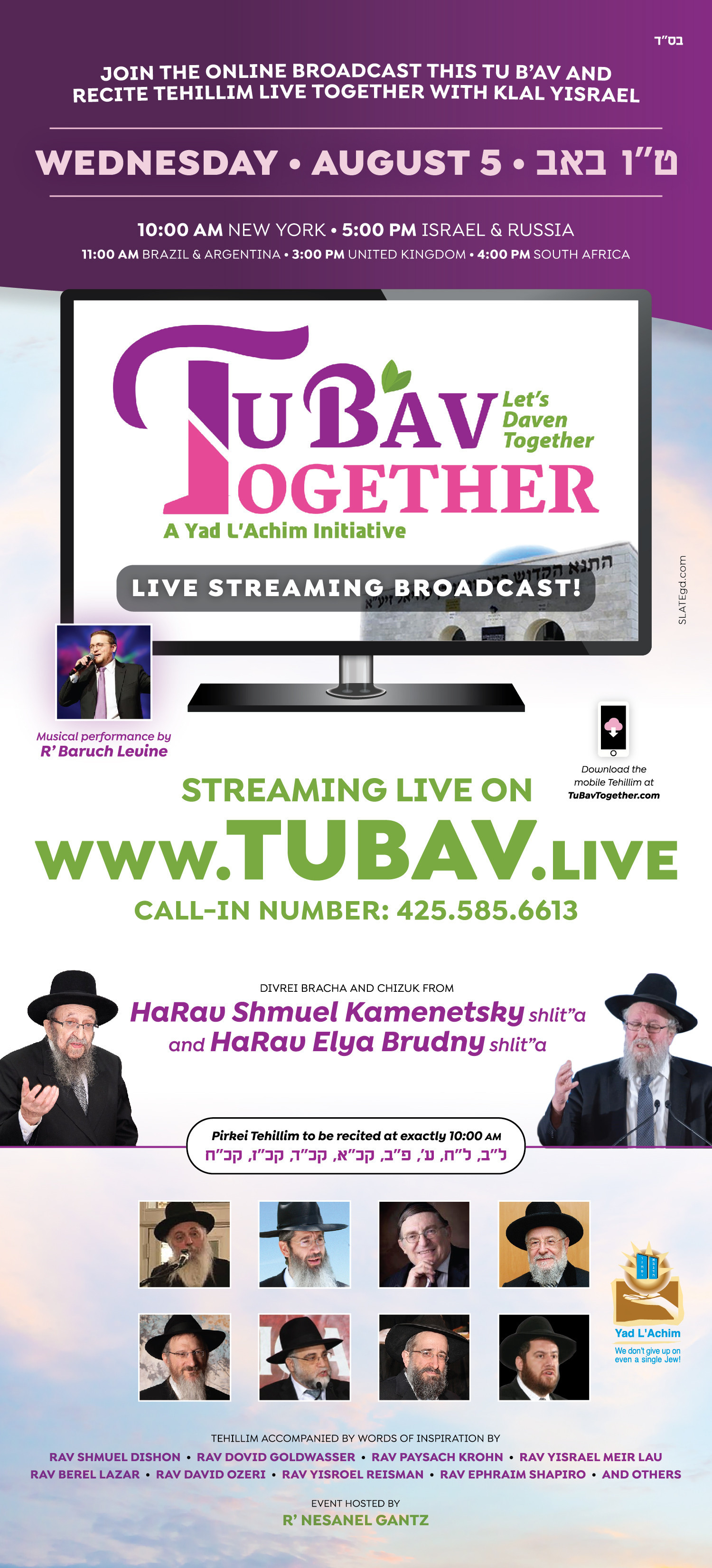 LIVE EVENT: On Tu B’Av, there will be a LIVE GLOBAL BROADCAST with divrei bracha from HaRav Shmuel Kamenetsky shlit”a and Rav Elya Brudny shlit”a and more! Say tehillim with Klal Yisrael. send an email to [email protected] to stay in the loop or send a whatsapp message to 1 (347) 395-6436