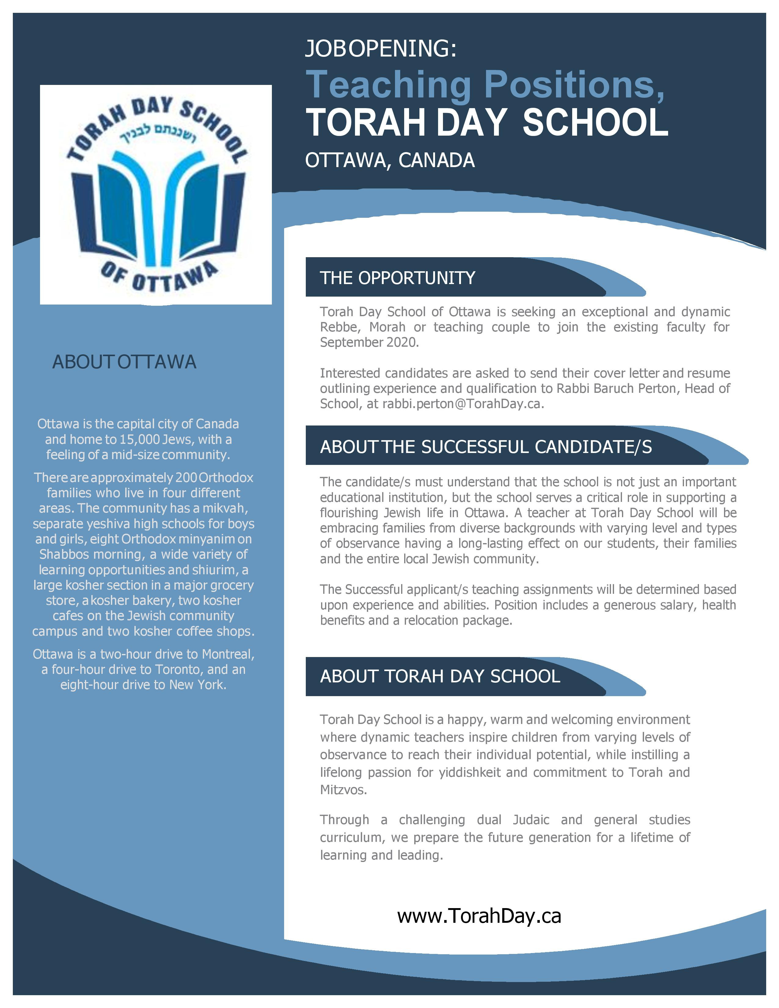 Job Opening: Torah Day School in Ottawa, Canada is hiring.