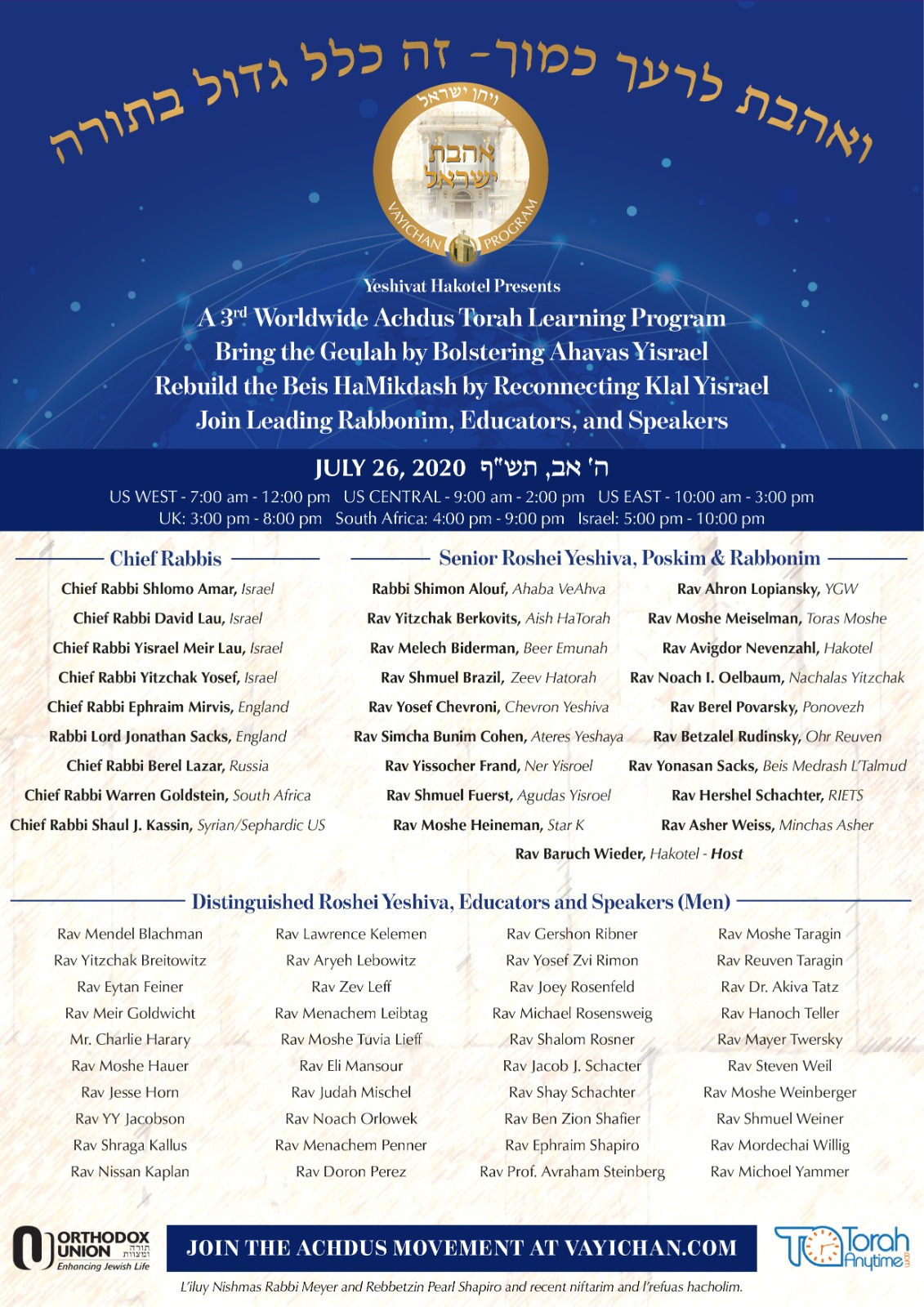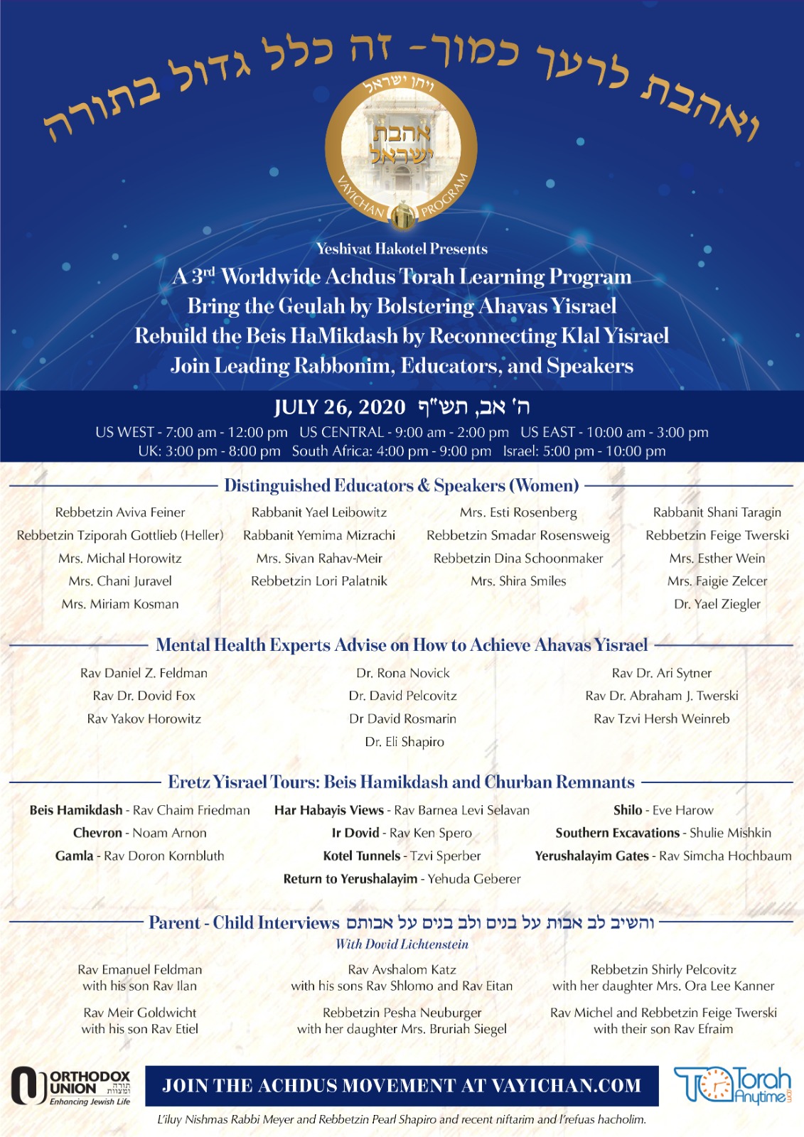 The program is headlined by nine of the world’s chief rabbis, over 100 senior roshei yeshiva, poskim and leading mechanchim and mechanchos from around the globe and from a broad hashkafic spectrum all speaking about topics related to ahavas yisrael and inyanei Tisha B’Av.