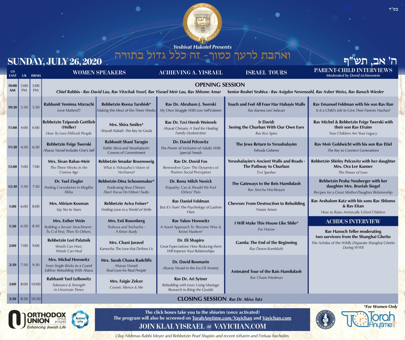 The program is headlined by nine of the world’s chief rabbis, over 100 senior roshei yeshiva, poskim and leading mechanchim and mechanchos from around the globe and from a broad hashkafic spectrum all speaking about topics related to ahavas yisrael and inyanei Tisha B’Av.