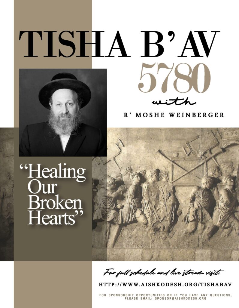 Our hearts are broken. Yet our souls are still yearning. The time is ripe for the final Geula! We must overcome the feelings of hopelessness and apathy. We must feel our own pain, the pain of our nation, and the pain of the Shechina. The time has come to cry out! With a world descending deeper into chaos, we find ourselves living in the most uncertain of times. From where can we draw the strength to heal our broken hearts and find the power to love one another and trust in HaShem? Aish Kodesh invites you to join the thousands of men and women around the world who will gather virtually for a truly unprecedented event, this Tisha B’Av, 5780, led by Rav Moshe Weinberger. This uplifting and powerful program will be live-streamed beginning Wednesday night at 8:20PM with Maariv, followed by words of inspiration and insight from Rav Weinberger prior to the reading of Eicha at 9:30PM. The program will continue Thursday morning with Shacharis at 8:00AM, followed by Kinos with commentary and Divrei Torah from Rav Weinberger through mid-day. The program will conclude with Rav Weinberger’s final address at 6:40PM on Thursday afternoon.