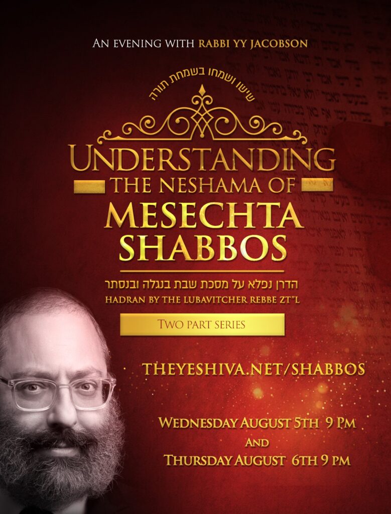In celebration of this monumental occasion, world-renowned teacher Rabbi YY Jacobson is delivering a two-part Shiur on the overarching theme and the soul of Meseches Shabbos.
