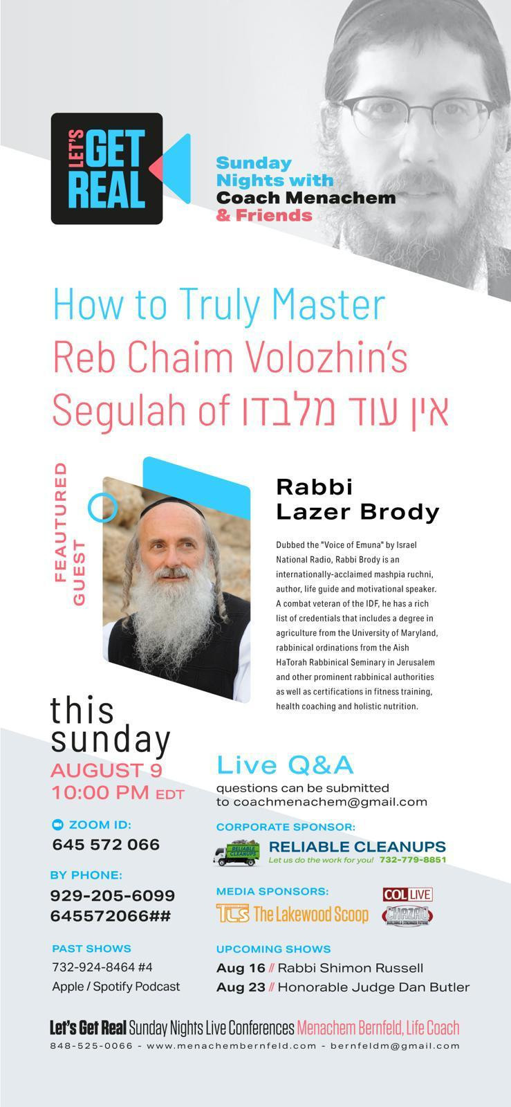 Watch the replay: Rabbi Lazer Brody (Live from Israel) – How to Master R Chaim Volozhins Promise of אין עוד מלבדו