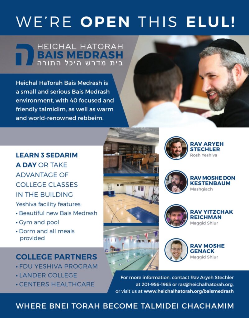 This past year, Heichal HaTorah of Teaneck, NJ began the Heichal HaTorah Bais Medrash. Designed for young men returning from yeshiva in Eretz Yisroel, HBM boasts world-class rebbeim, new facilities, serious and friendly chaveirim and an opportunity to earn a convenient and affordable college degree. The HBM will be open this Elul in-person.