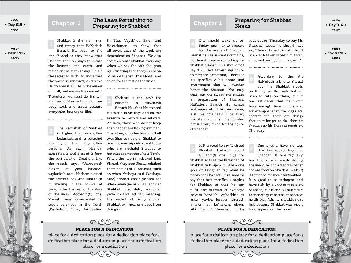 Dedications are available at a 100 dollars for each day of halachot, reserved towards the merit of your choice. You will be able to choose the desired date to dedicate, whether it be a regular day on the Hebrew calendar or for the first day of a Chag, a full months sponsorship, or even to dedicate the Sefer as a whole (Dedications for Chag, Month and for the whole Sefer vary, please inquire) . Every dedication will be written inside the Sefer, making the merit everlasting. Thousands of people around the world will be learning for the zechut of your desired dedication. Every dedication will receive a complementary Sefer.