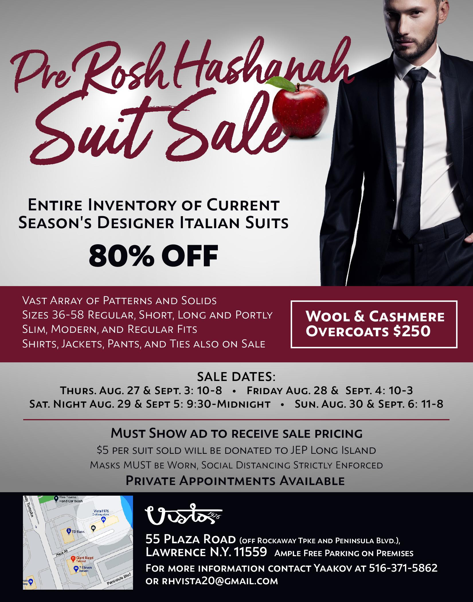 Vista 1976, 55 Plaza Rd Lawrence, NY is opening their warehouse to the public 8 DAYS ONLY, for a Pre Rosh Hashanah sale on Bresciani Italian Suits. All suits are 80% off, with $5 per suit being donated to JEP of Long Island.All suits are from the current season in sizes 36-54, regular, short, long, and portly.There is a wide selection of patterns and solids.Masks and social distancing will be strictly enforced and private appointments are available.For more information please contact Yaakov 516-371-5862 or email [email protected].