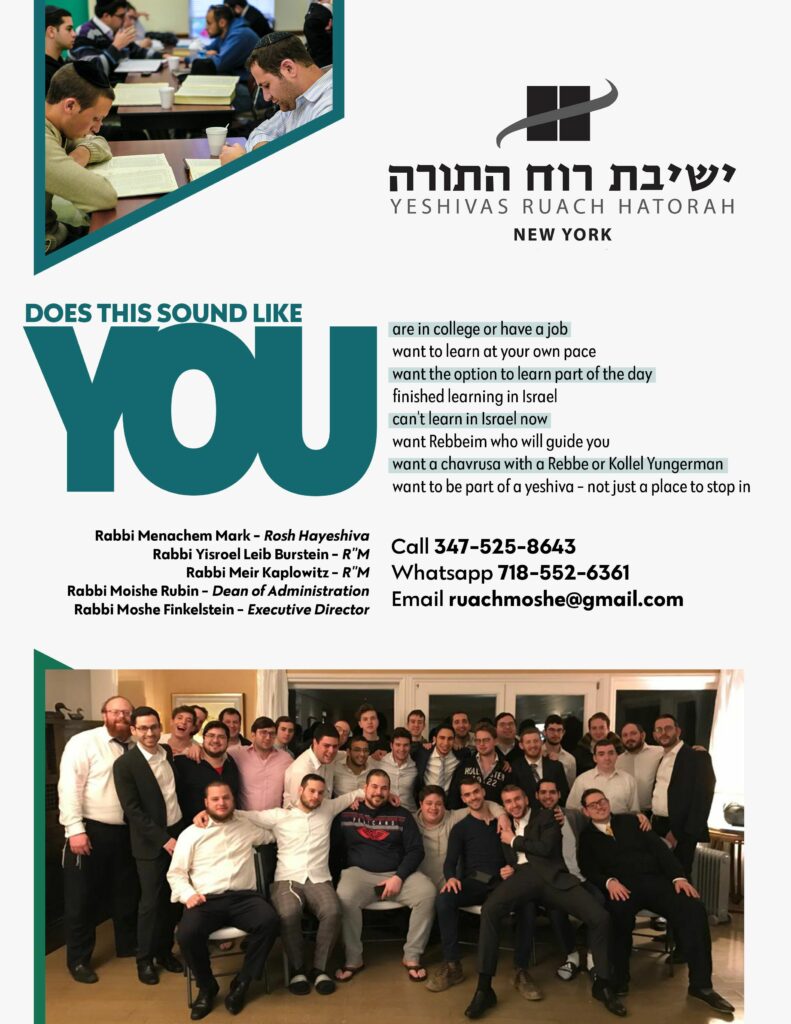 If you are looking for a Beis Medrash yeshiva for this Zman, Yeshivas Ruach HaTorah is the right place for you. Located in the heart of Flatbush, Yeshivas Ruach HaTorah has been connecting bachurim with learning, Rebbeim and friends for almost 20 years. With individualized programs and dormitory facilities, every bachur will find his place, whatever his personal needs or level of learning. Our uniquely inspiring ruach radiates both inside and outside of the Beis Medrash. Shabbos and Yom Tovim are infused with soul, spirit and song. This is not a yeshiva that you live in– it’s a yeshiva that lives in you! To be part of it all, call us @ 347.525.8643, WhatsApp 718.552.6361 or email [email protected]