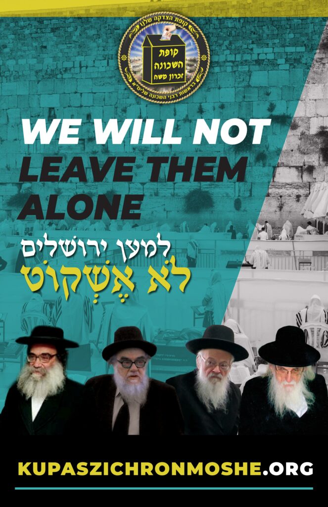Ten years ago, Kupas Zichron Moshe was established by Rav Aharon Nimerovsky to assist needy families in the Zichron Moshe neighborhood of Yerushalayim with their Shabbos and Yom Tov expenses. The kupah operates under the auspices of Rav Gamliel Rabinovich, Rav Avrohom Ehrlanger, Rav Moshe Elyashiv and Rav Yitzchok Soloveitchik.