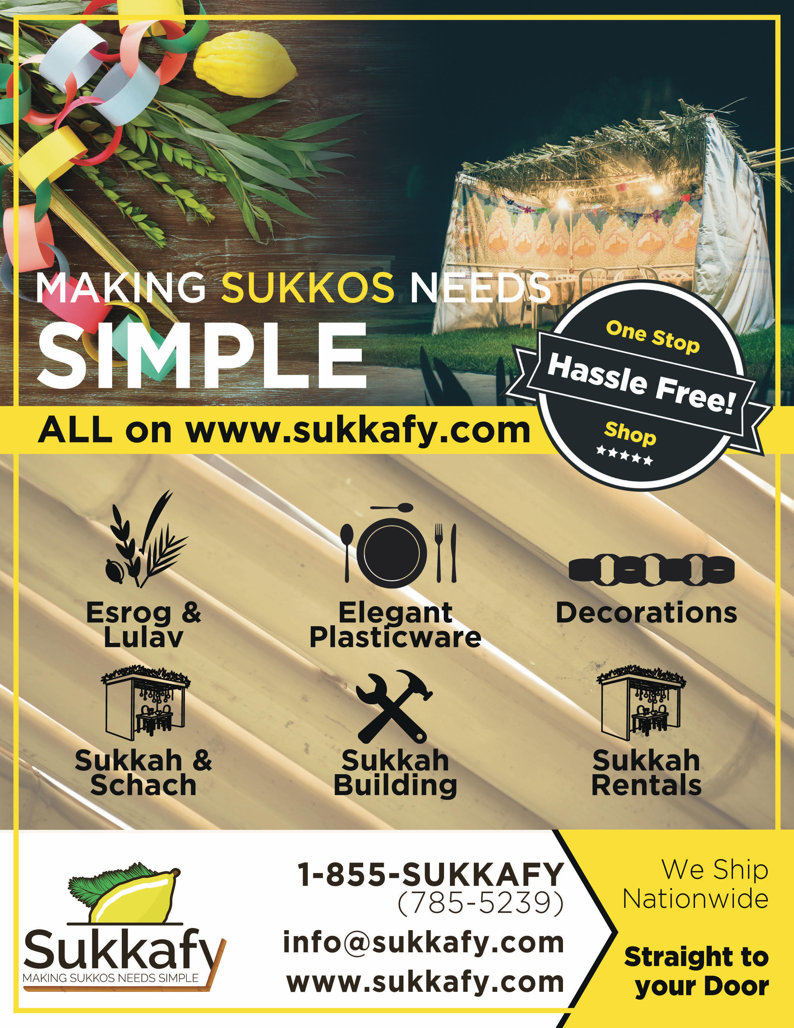 We have one mission: To use our expertise and connections to make all your Sukkos needs readily available at a modest price.  We want to bring you a platform where you can literally do ALL your Sukkos ALL your Sukkos shopping at your convenience. We hope you find our services useful and we hope it enhances the spirit of your Yom Tov.