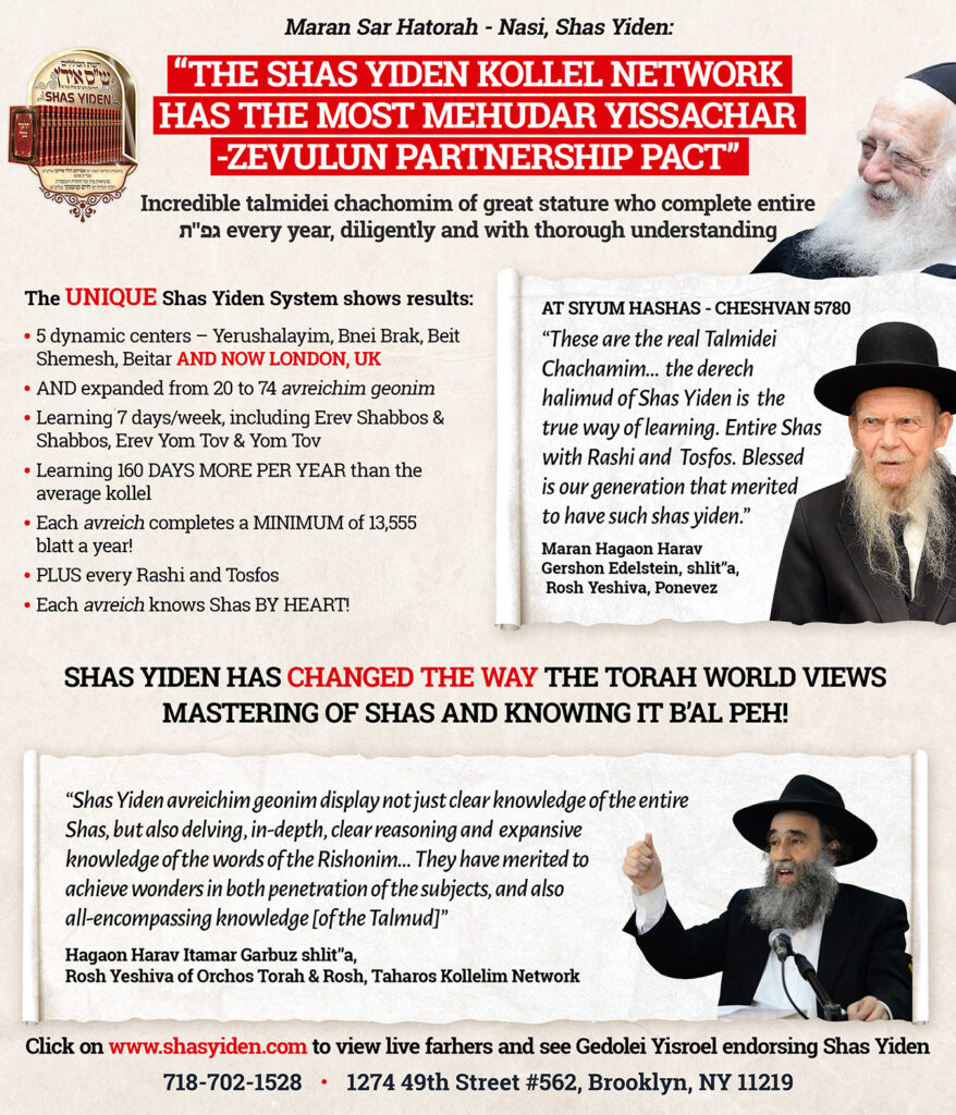 Maran Sar Hatorah – Nasi Shas Yiden: “The Shas Yiden Kollel Network Has The Most Mehudar Yissachar-Zevulun Partnership Pact”