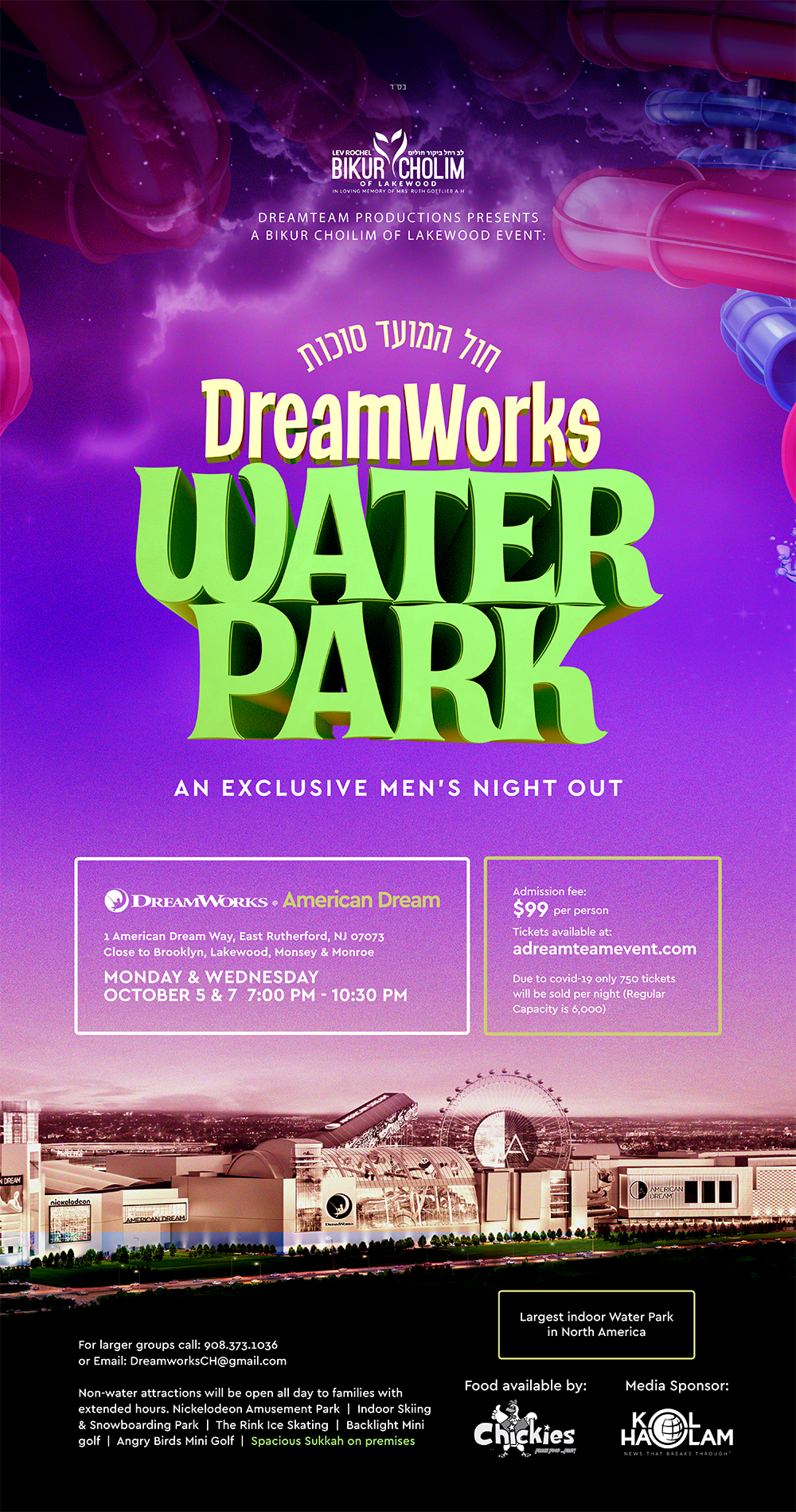 The entire park was rented for men only for two nights. This is the first time the Water Park in the American Dream opens, and Bikur Cholim was able to snag it for the community. There will be kosher food available for purchase by famed Chickies and a spacious sukkah.