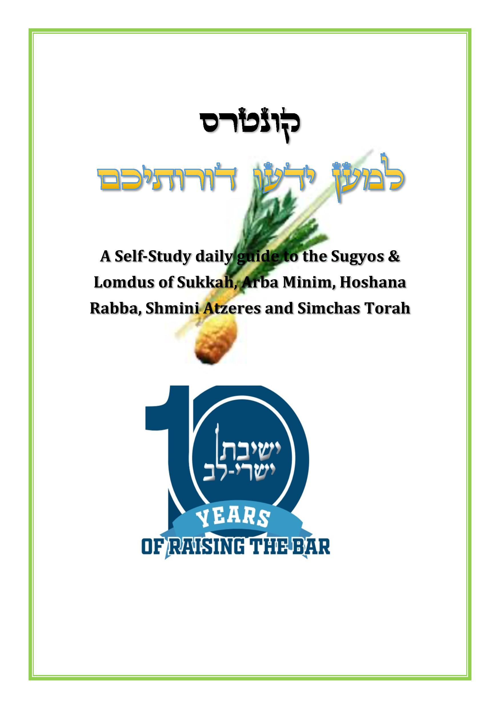 Yeshivat Yishrei Lev in TelzStone, Israel, is excited to present this year’s edition of “L’Maan Yeidu Doroseichem”! This Sefer is formatted in an original, daily, self-study style. Starting from Erev Sukkos through the Isru Chag, the Sefer presents a daily “Sugya” with guided “Mareh Mekomos” for both the layman, Yeshiva Bachur, and Talmid Chacham. All of the important and significant topics relating to our celebration of Sukkos are covered, exposing the reader to the beauty of the “Lomdus” of Mitzvas Yeshivas Sukka, Arba Minim, and many other Sukkos topics. This is the perfect way for Chavrusos and/or parents and children to gain their own in-depth analysis of these critical topics at their own pace and level.