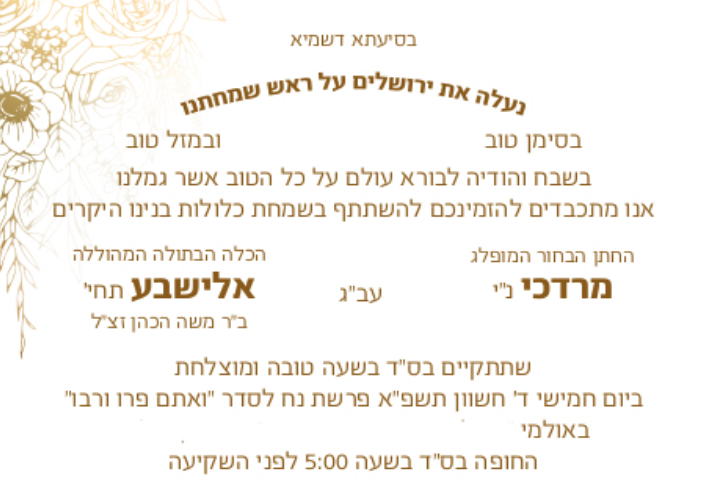 Hello, my name is Elisheva. I am part of a family of 10 children, bli ayin hora, and we live in Eretz Yisrael. Our father raised us until he was niftar about a year ago. My mother, unfortunately, is currently being treated for a serious illness. Despite all of this, I must thank Hashem from the bottom of my heart for finding me my chosson, a wonderful ben Torah, who I will be married to in about 3 weeks.