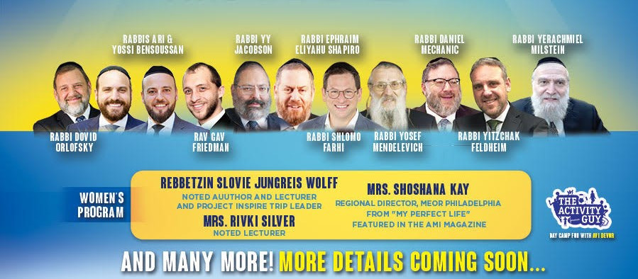 Join the incredibly inspiring weekend, and hear from notable speakers such as Rabbi Dovid Orlofsky, Rabbis Ari and Yossi Bensoussan, Rav Gav Friedman, Rabbi YY Jacobson, Rabbi Ephraim Eliyahu Shapiro, Rabbi Shlomo Farhi, Rabbi Yosef Mendelevich, Rabbi Daniel Mechanic, Rabbi Yitzchak Feldheim, and Rabbi Yerachmiel Milstein.