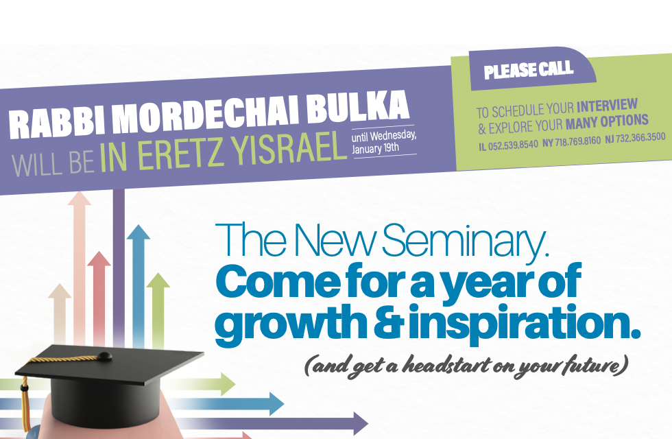 Rabbi Mordechai Bulka of The New Seminary is now in Eretz Yisroel to interview prospective students for the next school year. He will be there until Wednesday January 19th.