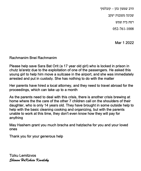 Rachmanim Bnei Rachmanim – please help save Sara Bat Orit (a 17 year old girl) who is locked in prison in chutz la’aretz due to the exploitation of one of the passengers. He asked this young girl to help him move a suitcase at the airport, and she was immediately arrested and put in custody. She has nothing to do with the matter. CLICK HERE TO DONATE!