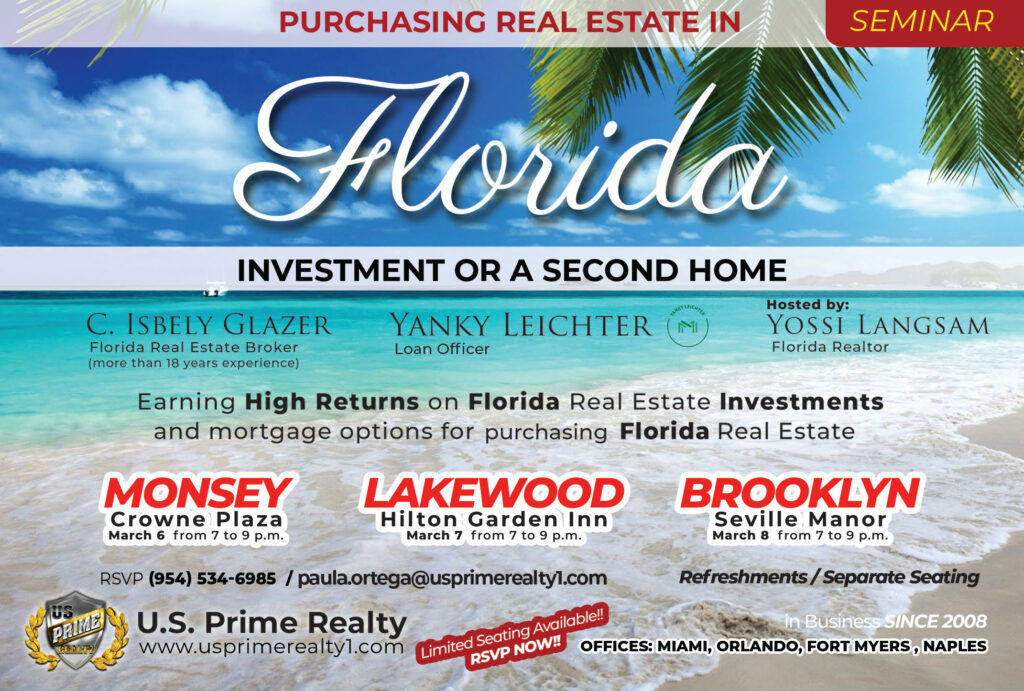 Glazer, hosted by Florida Realtor Yossi Langsam, and accompanied by Loan Officer Yanky Leichter, is conducting an all-inclusive Seminar in Boro Park, Monsey, and Lakewood that will educate potential buyers with the valuable data in a one-stop-shop.